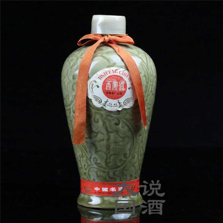 此款西凤酒瓶子是用刻花绿瓶,样子非常精致典雅,非常罕见
