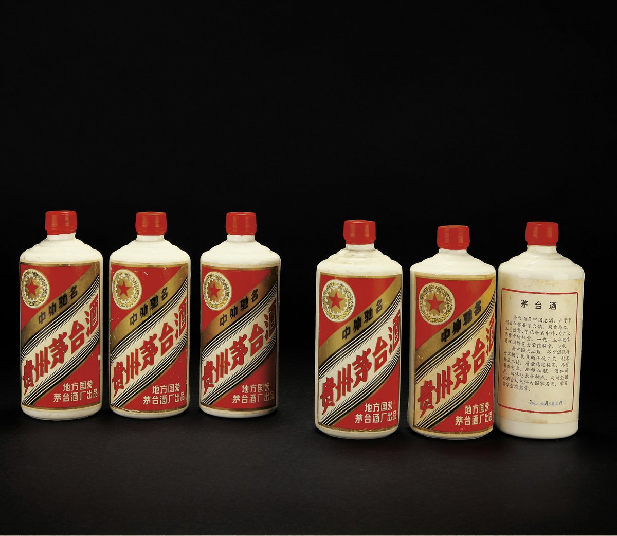 1983-1986年五星牌贵州茅台酒正标右下角有“地方国营茅台酒厂出品”,故称“地方国营”正红色封膜,顶部启用凸起“茅台”两个字组成的圆形暗记,被称为暗记,更具美感、时代感和防伪功能!前几年被炒到四万多,不少收藏酒友买了很多,不到一段时间直接便宜一半,还是希望酒友理性收藏,不要盲目的跟风随便收藏,这种地方国营茅台酒不到三万一定要留意行情
