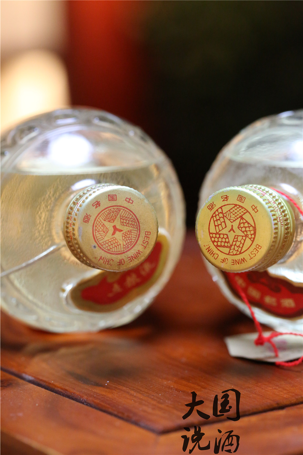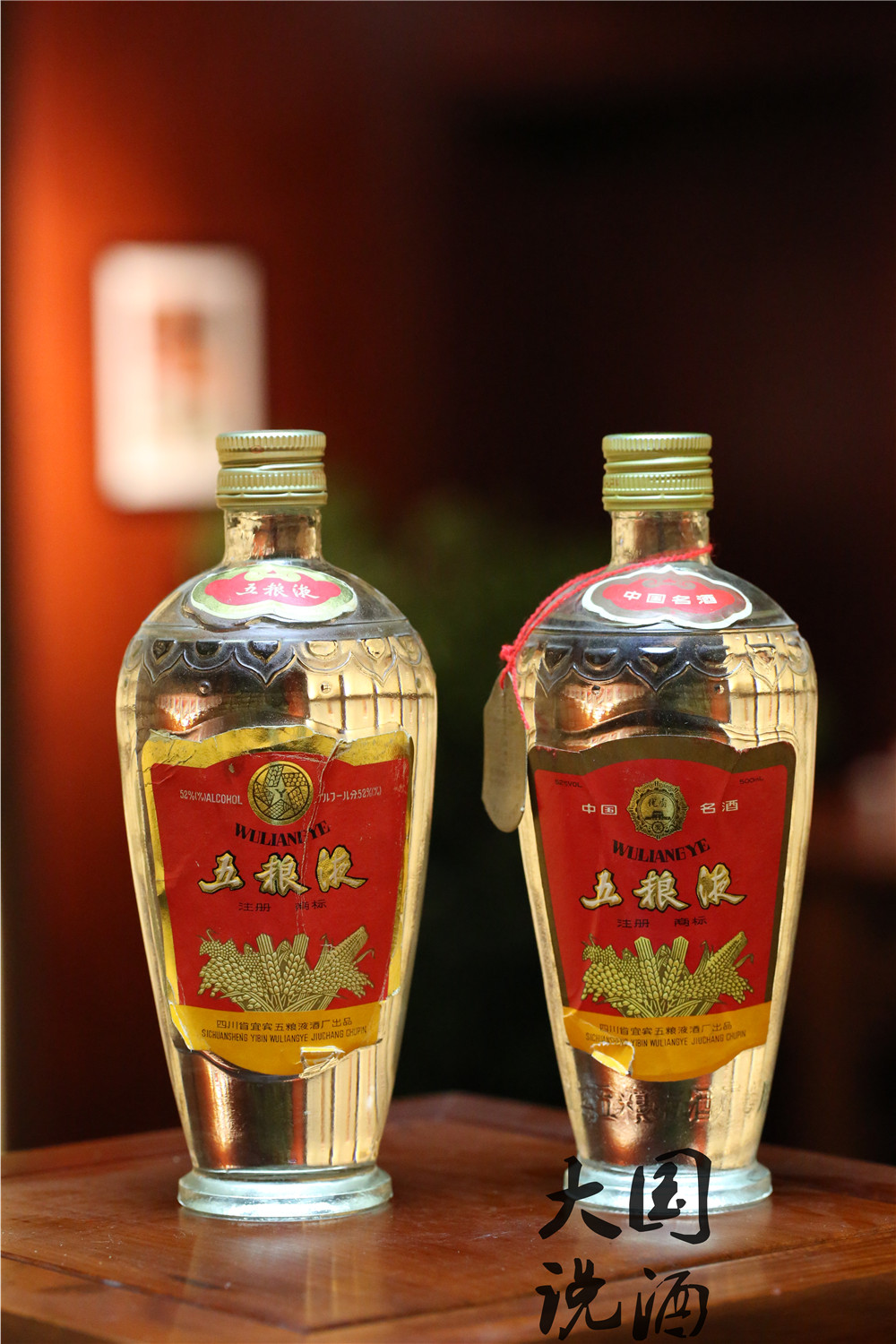 虽然这两瓶都是萝卜瓶五粮液,左边一瓶为80年代末,右边为90年代初期。 除了通过商标背面的生产日期能断定年代外,盖子上也能分出来。 左边盖子顶部的图案是由两个圆圈组合成,且中间有空隙。这是八十年代末五粮液的盖子特征,被称为“双圈”五粮液。 右边盖子顶部的图案是一个圆圈,这是九十年代初期五粮液盖子特征 ,被称为“单圈”五粮液。