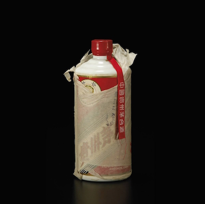 此外,瓶口系有红色飘带,飘带上分别刺绣有“中國貴州茅台酒”。外包裹白棉纸,棉纸上印有红色的“中國貴州茅台酒”并加盖蓝色大写生产日期。