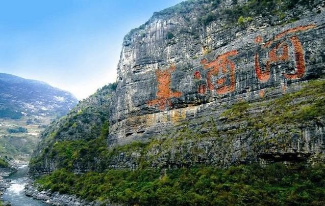 在赤水河中游吴公岩古盐渡绝壁上有一方“美酒河”三个字的巨幅摩崖,下距奔腾的赤水河近百米。这摩崖上,三个字的石刻总面积达48平方米,它们分别所占面积为:“美”字高41.2米、宽33.45米;“酒”字高31.62米,宽20.42米;“河”字高34.39米、宽32.57米,石刻着朱色,数里之外观之,磅礴雄奇。1999年6月,上海大世界吉尼斯总部评定它为世界上最大的摩崖石刻汉字。