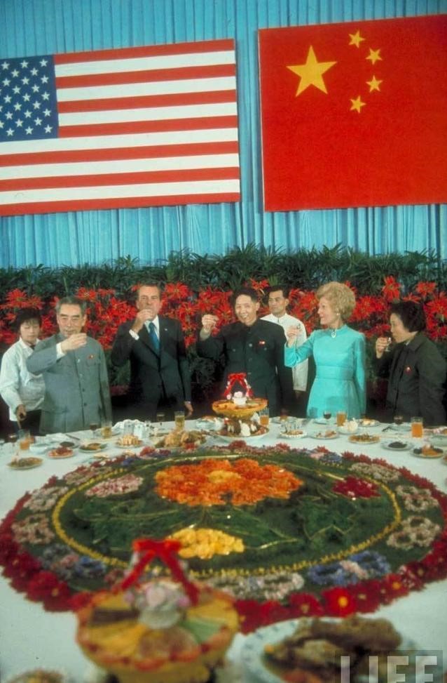 当晚,当周恩来总理举起筷子时,这意味着晚宴正式开始。在现在可以看到的电视画面中,尼克松总统努力用筷子将菜肴夹到自己的盘子里,小心翼翼地看了一下,然后放到了自己的嘴中咀嚼。全世界都通过这个画面看到美国总统品尝中国菜。