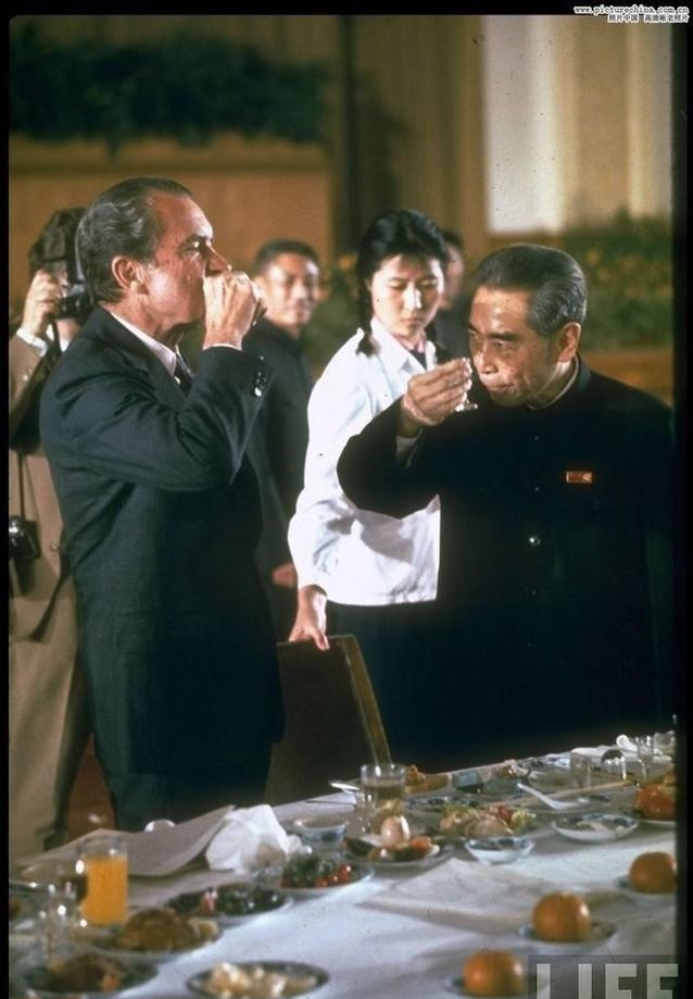 令美方头疼的,不是美食,而是茅台酒。在基辛格看来,这种烈性酒“不做飞机燃料太可惜了,是因为它太易燃”了。负责为尼克松安排日程的秘书表示,在与周恩来碰杯祝酒之前,尼克松已经被提醒不要真正喝中国的烈性酒茅台,只要举起杯来碰一下嘴唇即可。