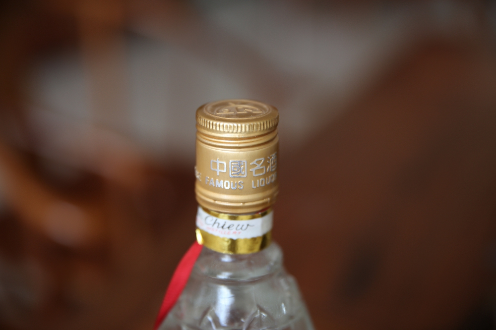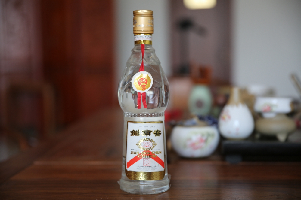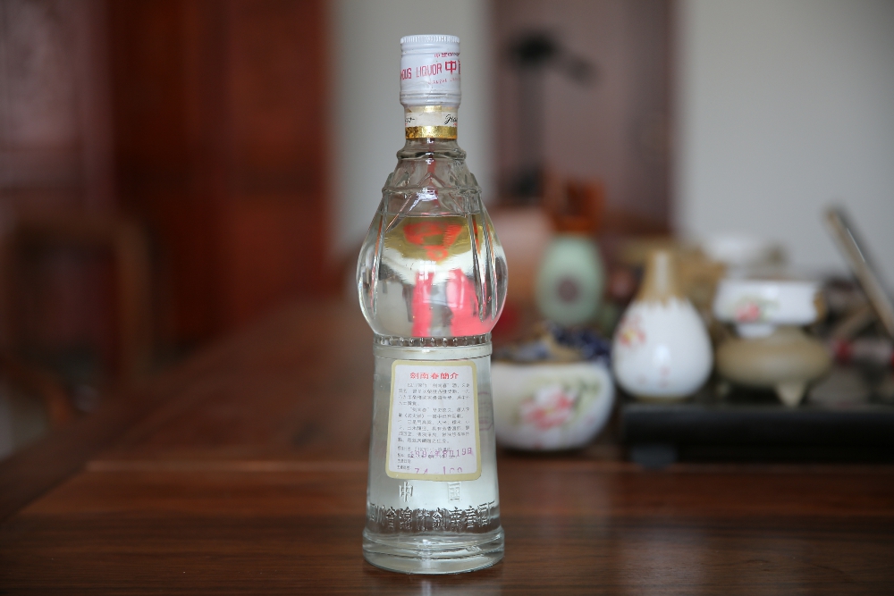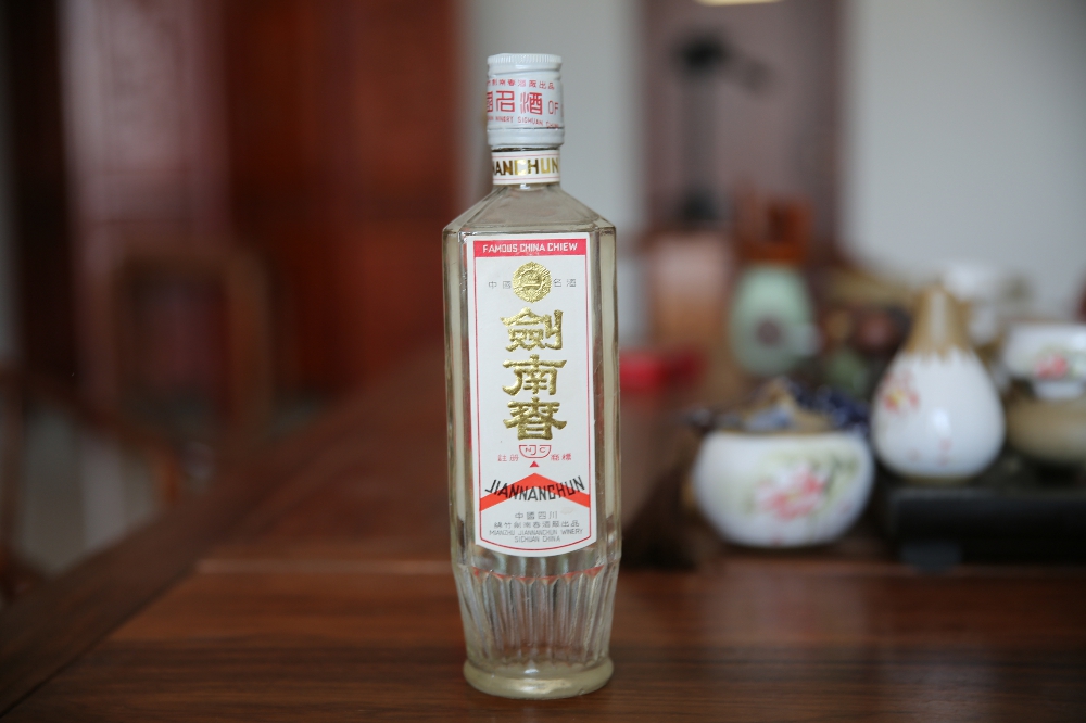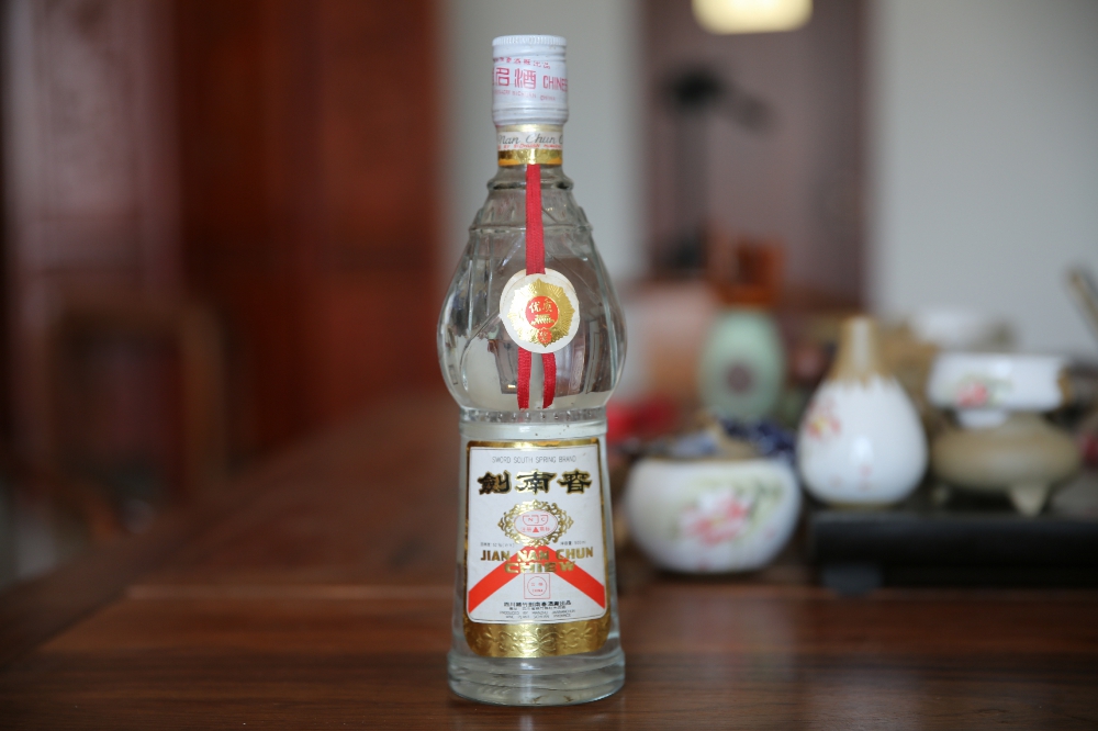 而到了90年代中期,徐帆和儿子、儿媳一起吃火锅时喝的依然是“剑南春”,瓶子当然也换了新包装。这款剑南春生产年代为1990年到1994年结束,因为盖子为白色扭断式铝盖,我把它简称为“白盖剑南春”