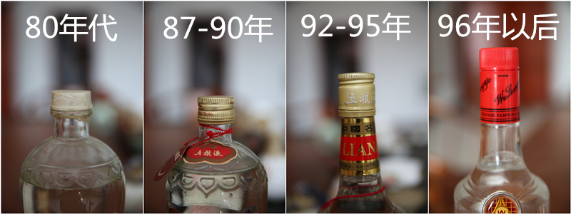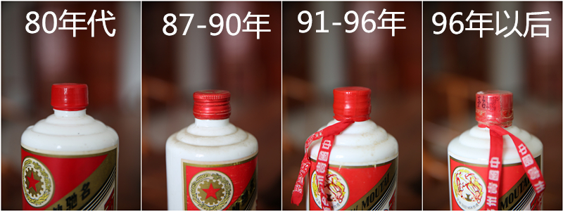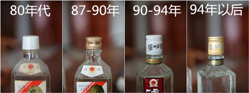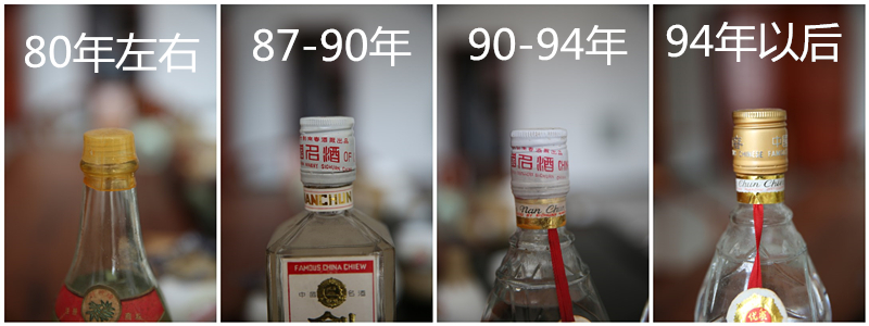好多朋友都问我陈年白酒的包装品种太多了,太乱了找不到头绪。其实细心的朋友会发现它的包装变化都是有规律的,特别是盖子变化,几大名酒基本上是一致。相信你看我下面的解说后,就会彻彻底底明白了,不再那么摸不到头绪了。白酒60年代的盖子基本为木塞,七八十年代为塑料盖,从1987年开始又基本换成了黄颜色比较矮的螺旋铝盖,到了90年代初期为比较高的白色螺旋铝盖,后期变为黄颜色的了。看看下面的图片你们就明白了。