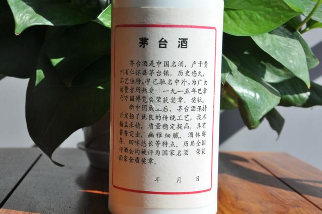 1993年4月28日--1995年11月23日出产的酒特征如下:A、背 标与食品小标签印在同一张纸上,不再分别印刷;B、日期、批号字体为红色。l996年5月15日以后,背标上的厂址中的“仁怀县”改为“仁怀市”。 1997年1月31日后,背标上原料一栏加“水”字。 3、贵州茅台牌(飞天)53%(V/V)500ml商标于1992年6月22日启用,l992年6月22日--1996年3月25日分别使用了背标和食品 标签;1996年3月25日起食品标签停用,其上的内容打印于彩盒二层盖上、字样颜色为黑色,其上的批号、日期喷印在瓶口;自1996年7月16日起彩盒 上的厂址中的“仁怀县”改为“仁怀市”。商标1997年3月25日起改小2—3毫米,背标未变。 4、“五星”“飞天”4 3%(v/v)500ml商标于1992年5月8日启用,分别使用了背标和食品小标签;1996年9月23日起食品小标签停止使用,其内容打印于彩盒二层 盖上,字体颜色为黑色,1996年12月3日起字体由黑变红。“飞天”商标l997年8月起改小,背标未变。 5、38%(V/V)5 00ml商标于1992年3月31日启用,分别使用了背标和食品小标签;1996年4月18日起食品小标签停止使用,内容打印于彩盒二层盖上、字体为黑 色,1996年8月7日起字体由黑改为黄色,商标1997年4月24日改小,背标未变。 6、凡500ml装茅台酒其瓶盖均于1996年8月19日以后改用意大利进口防盗瓶盖,胶帽为透明无色。l998年1月1日启用美国3M公司激光防伪于瓶口处。