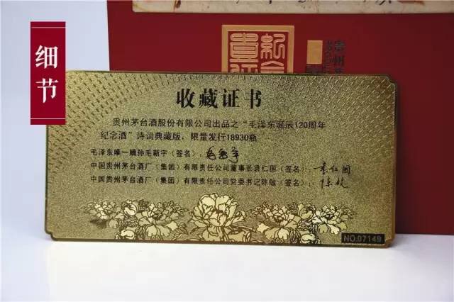 本品酒盒上印有毛泽东真迹拓印体,随盒附有收藏证书,证书上有毛泽东唯一嫡孙毛新宇、茅台酒厂董事长袁仁国、党委书记陈敏亲笔签名,限量发行18930瓶。