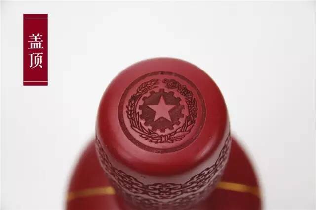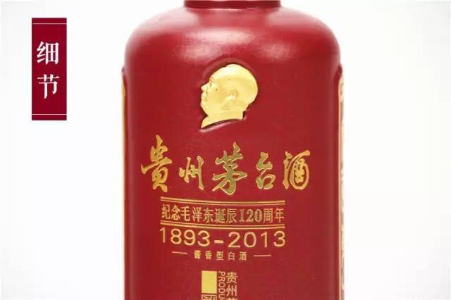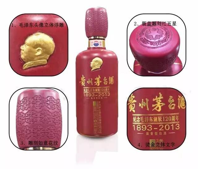 酒瓶瓶身上烙印烫金毛泽东头像徽章,瓶盖精心雕刻红五星与如意花纹,正面瓶身印有毛泽东诞辰120周年(1893——2013)烫金字体,两侧分别以小篆字体印有“如意东方、祖国吉祥”八个大字,背面是小篆“纪念毛泽东诞辰一百二十周年”字样与毛泽东字“润之”两字。